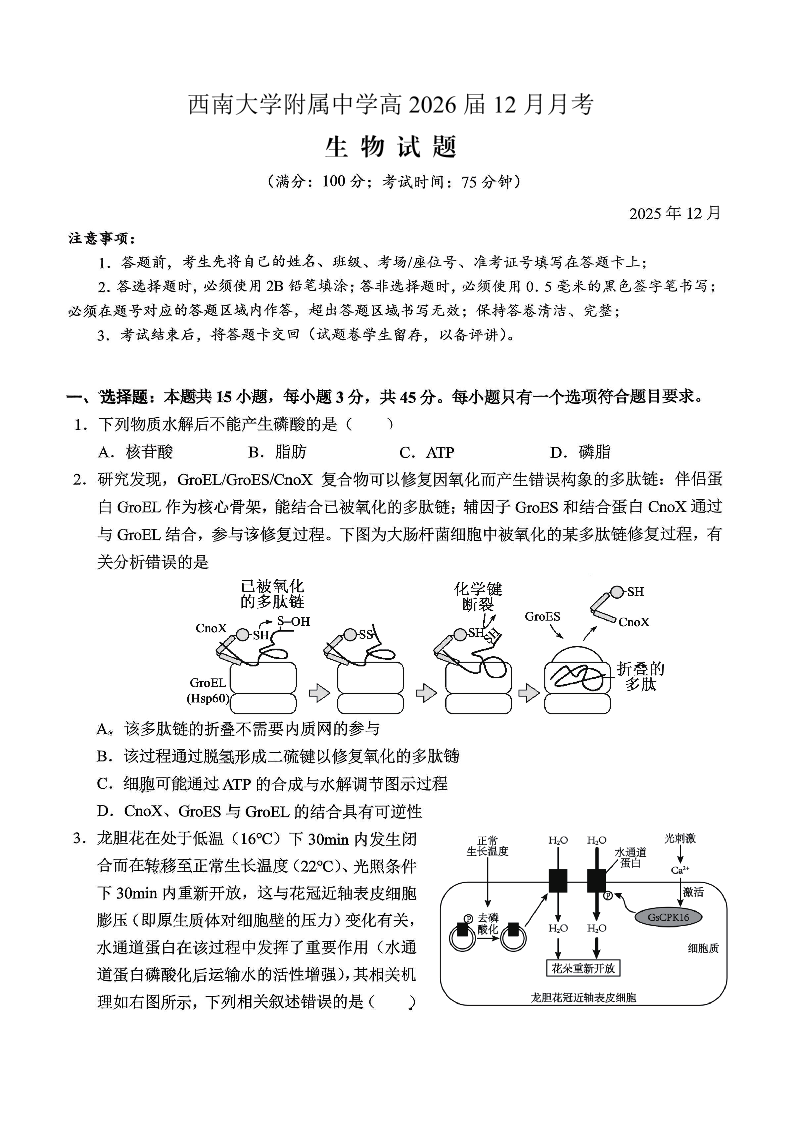 重庆西南大学附属中学高2026届高三12月月考 生物.pdf