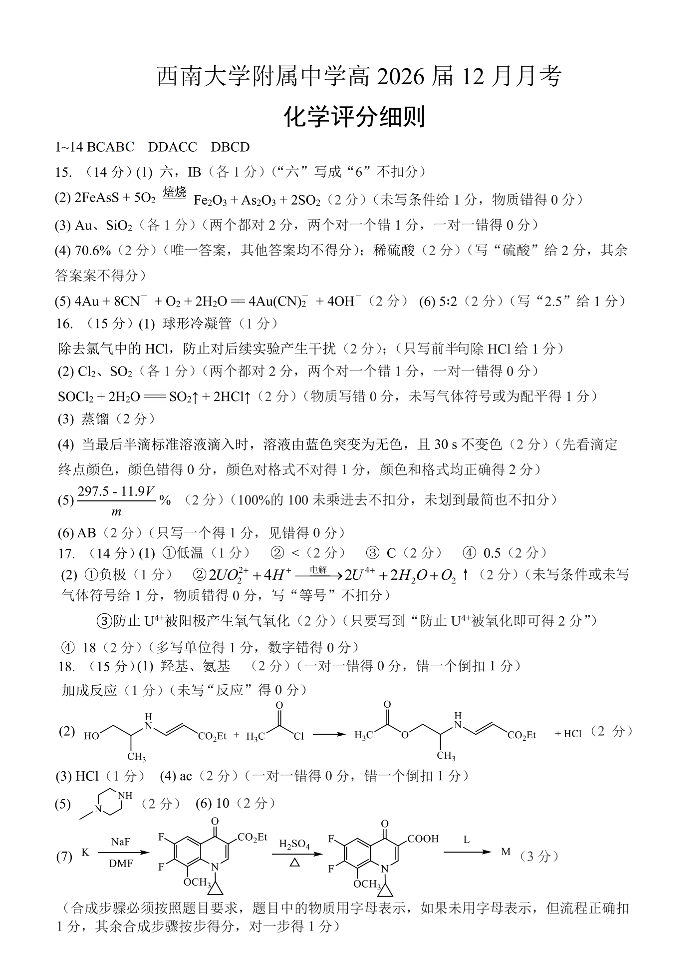 重庆西南大学附属中学高2026届高三12月月考 化学答案.pdf