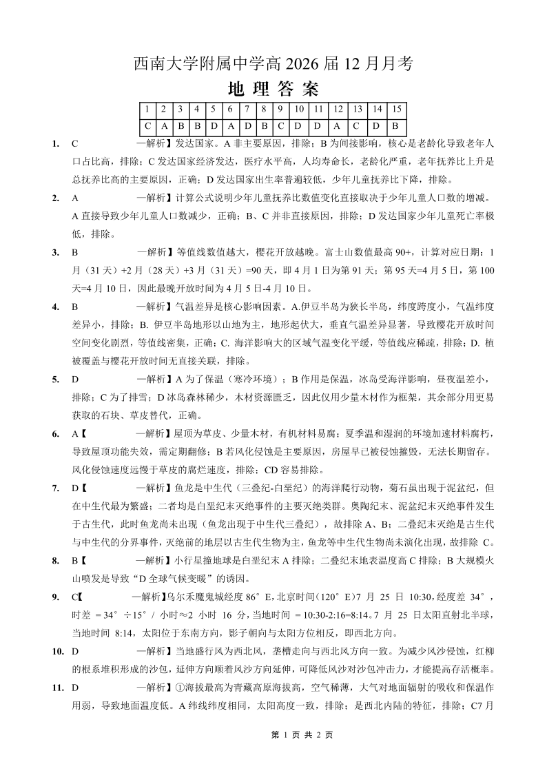 重庆西南大学附属中学高2026届高三12月月考 地理答案.pdf