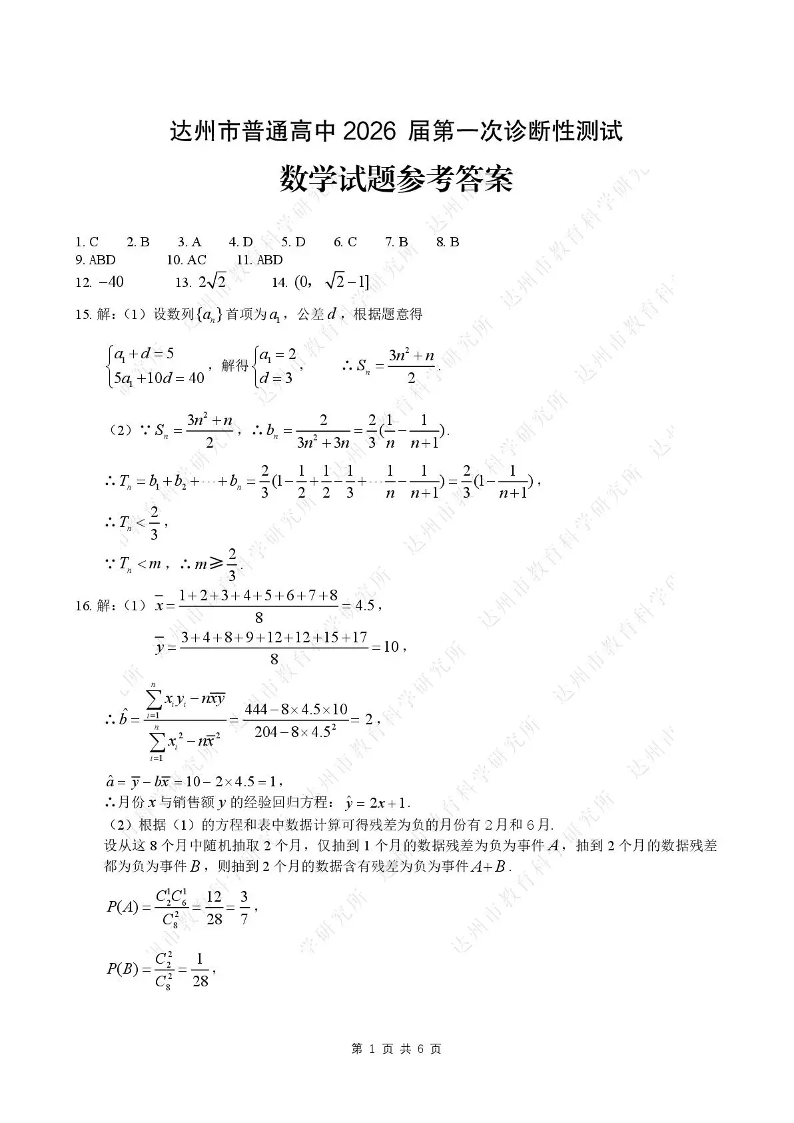 达州市普通高中2026届第一次诊断性测试 数学答案.pdf