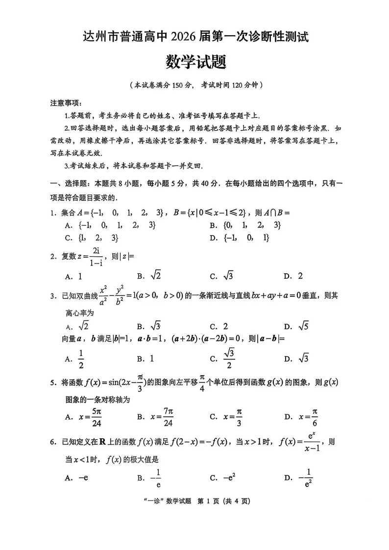 达州市普通高中2026届第一次诊断性测试 数学.pdf