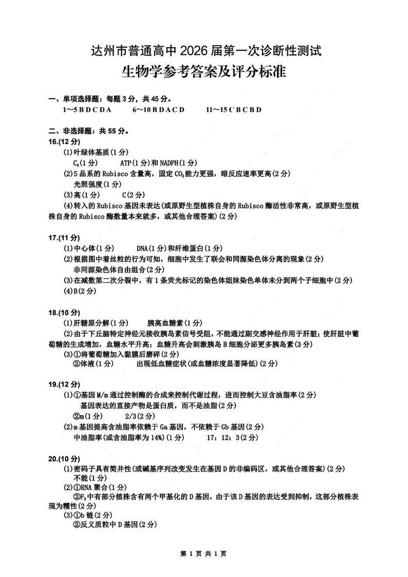达州市普通高中2026届第一次诊断性测试 生物答案.pdf