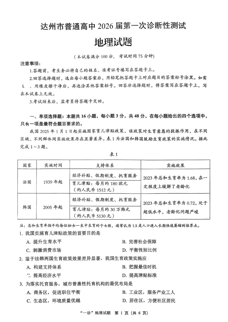 达州市普通高中2026届第一次诊断性测试 地理.pdf