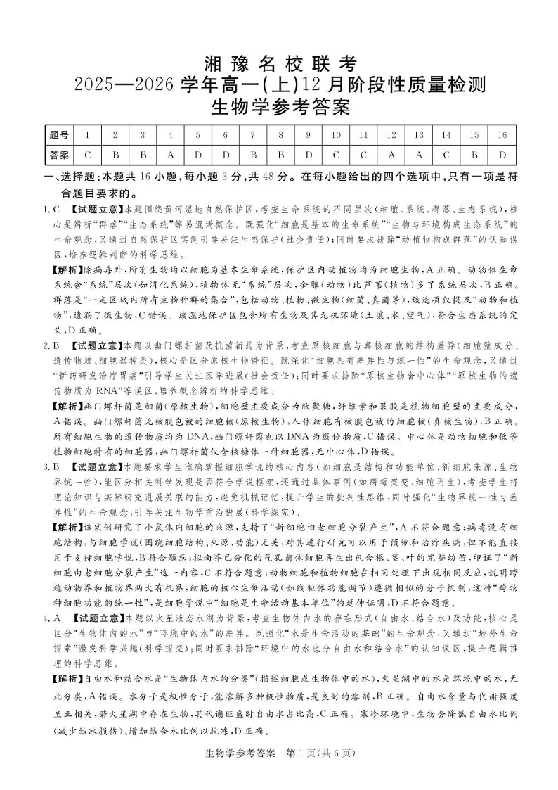 湘豫名校联考2025-2026学年高一(上)12月阶段性质量检测 生物答案.pdf