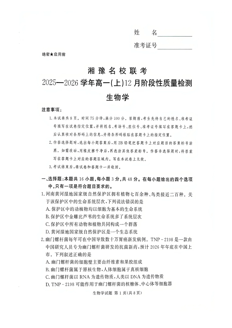湘豫名校联考2025-2026学年高一(上)12月阶段性质量检测 生物.pdf