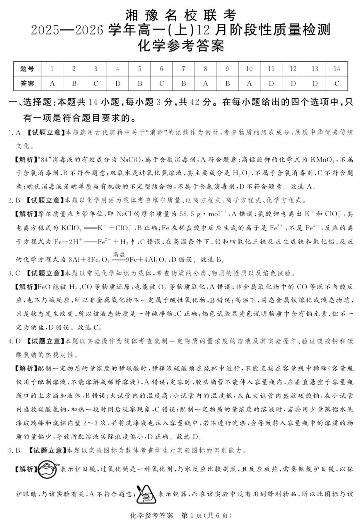 湘豫名校联考2025-2026学年高一(上)12月阶段性质量检测 化学答案.pdf