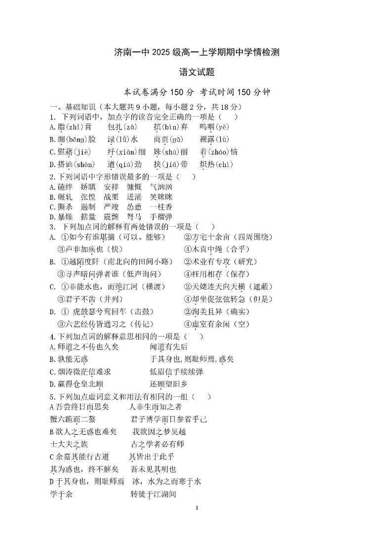 山东省济南第一中学2025-2026学年高一上学期期中学情检测 语文.pdf