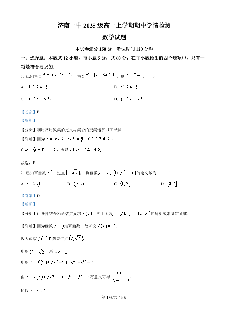 山东省济南第一中学2025-2026学年高一上学期期中学情检测 数学答案.docx