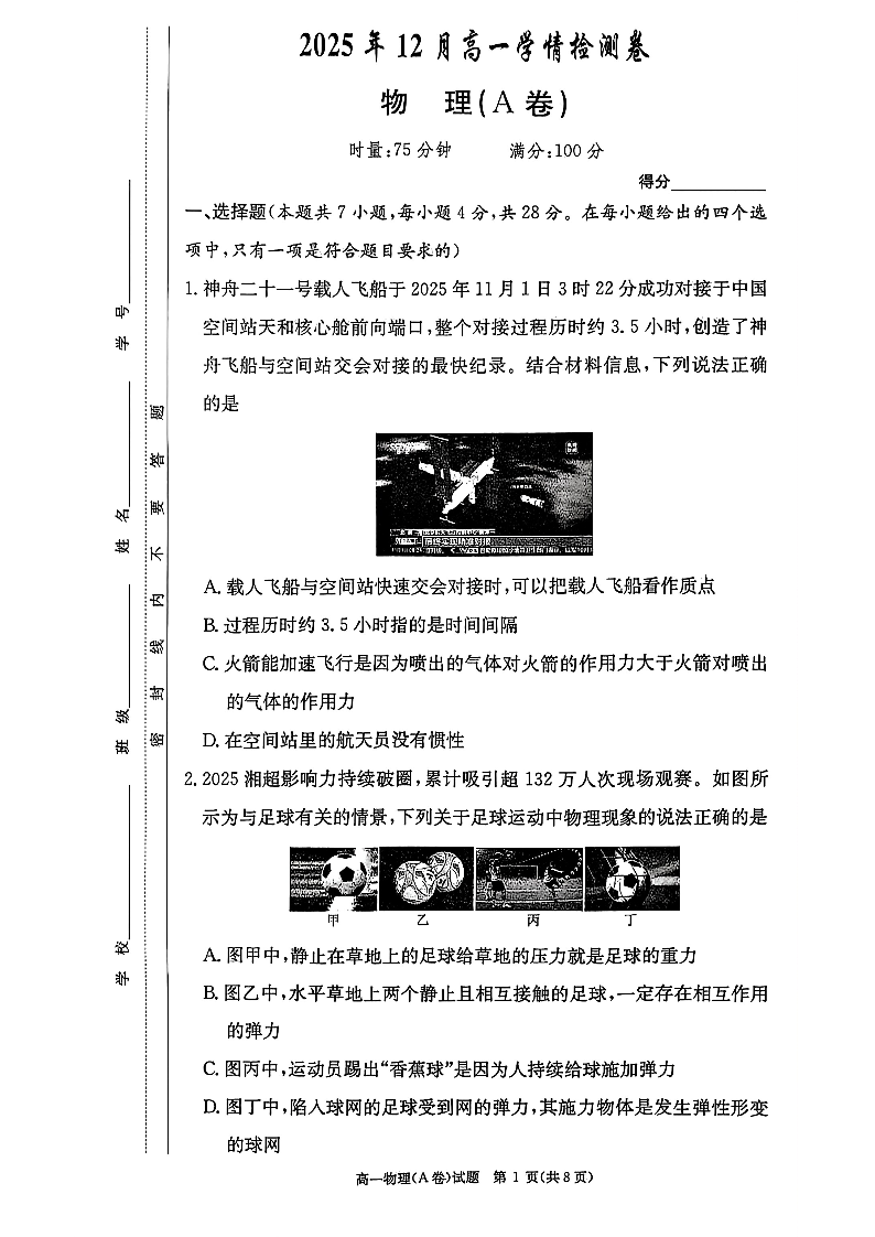 湖南省新高考教学教研联盟(长郡20校)2025年12月高一学情检测 物理(A卷).pdf