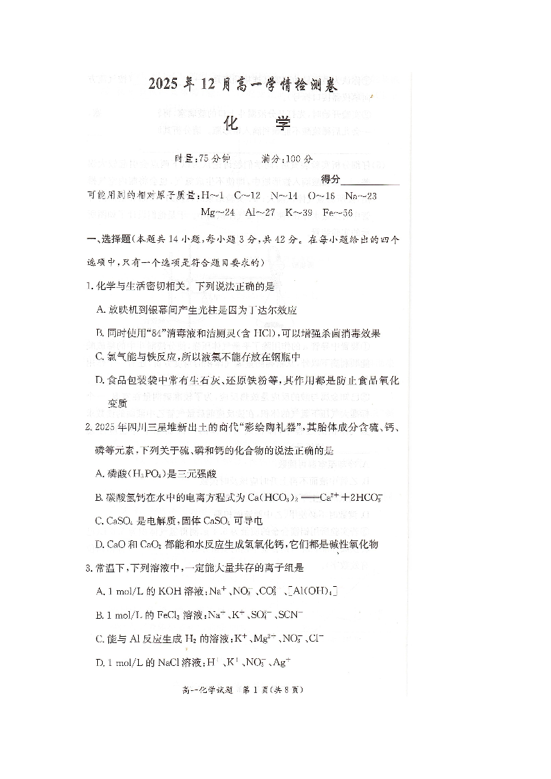 湖南省新高考教学教研联盟(长郡20校)2025年12月高一学情检测 化学.pdf
