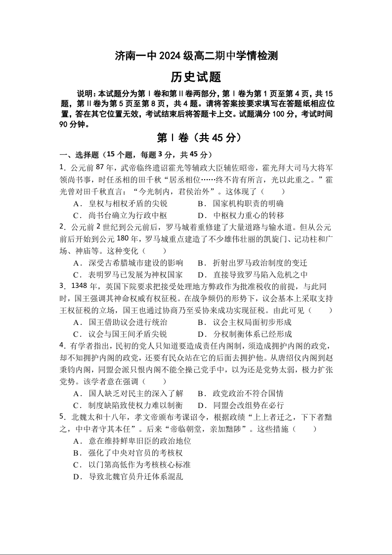 山东省济南第一中学2025-2026学年高二上学期期中学情检测 历史试题(含答案).docx