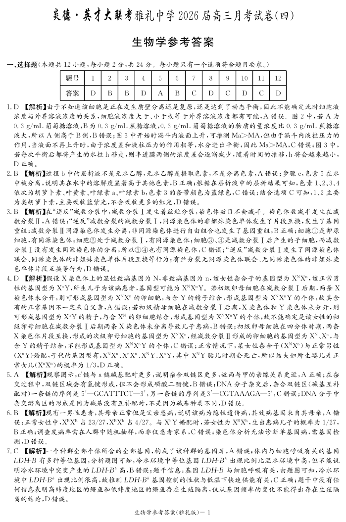 雅礼中学2026届高三月考试卷(四)生物答案.pdf