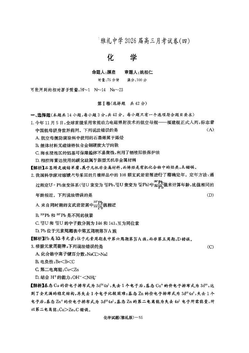 雅礼中学2026届高三月考试卷(四)化学.pdf