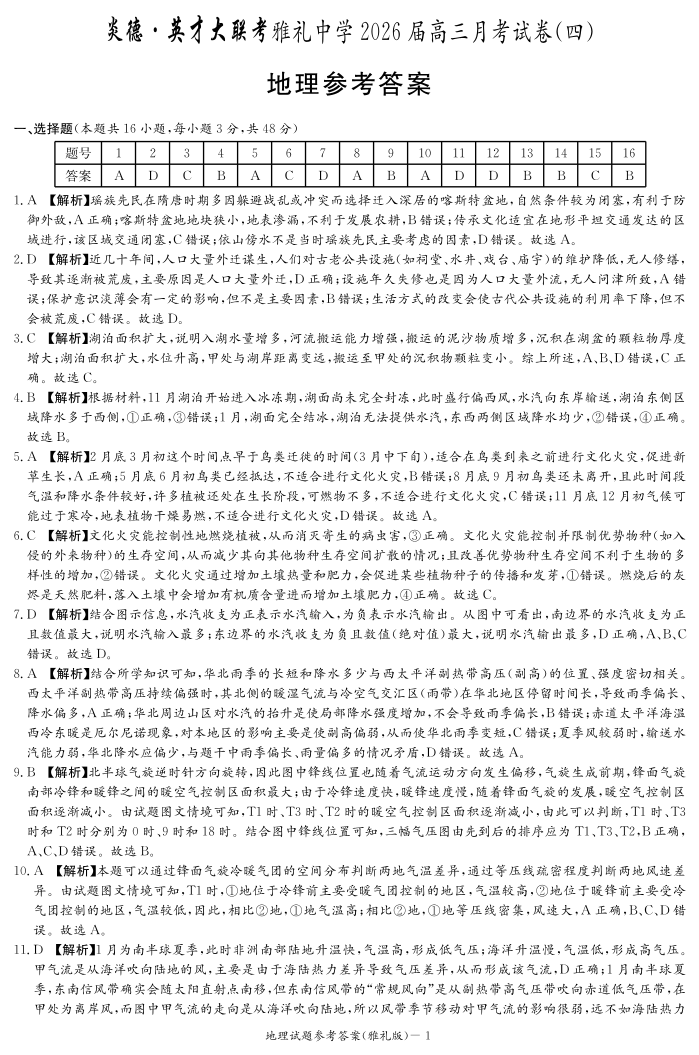雅礼中学2026届高三月考试卷(四)地理答案.pdf