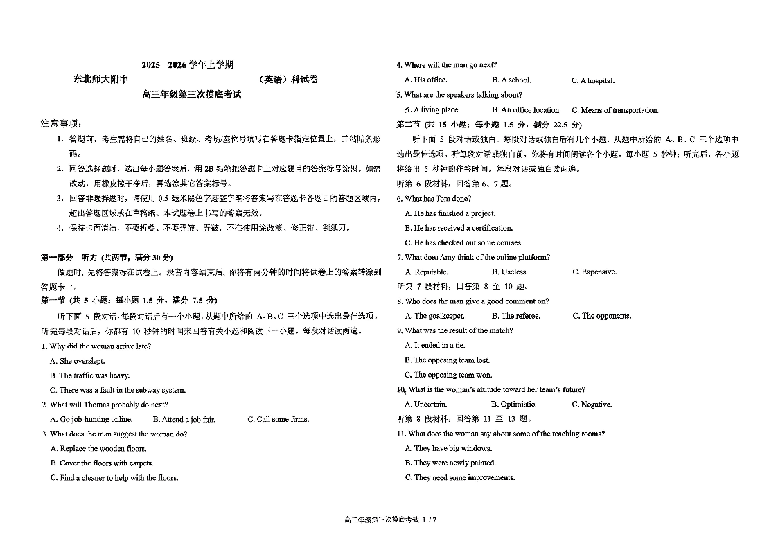 东北师范大学附属中学2025-2026学年高三上学期第三次摸底考试 英语.pdf