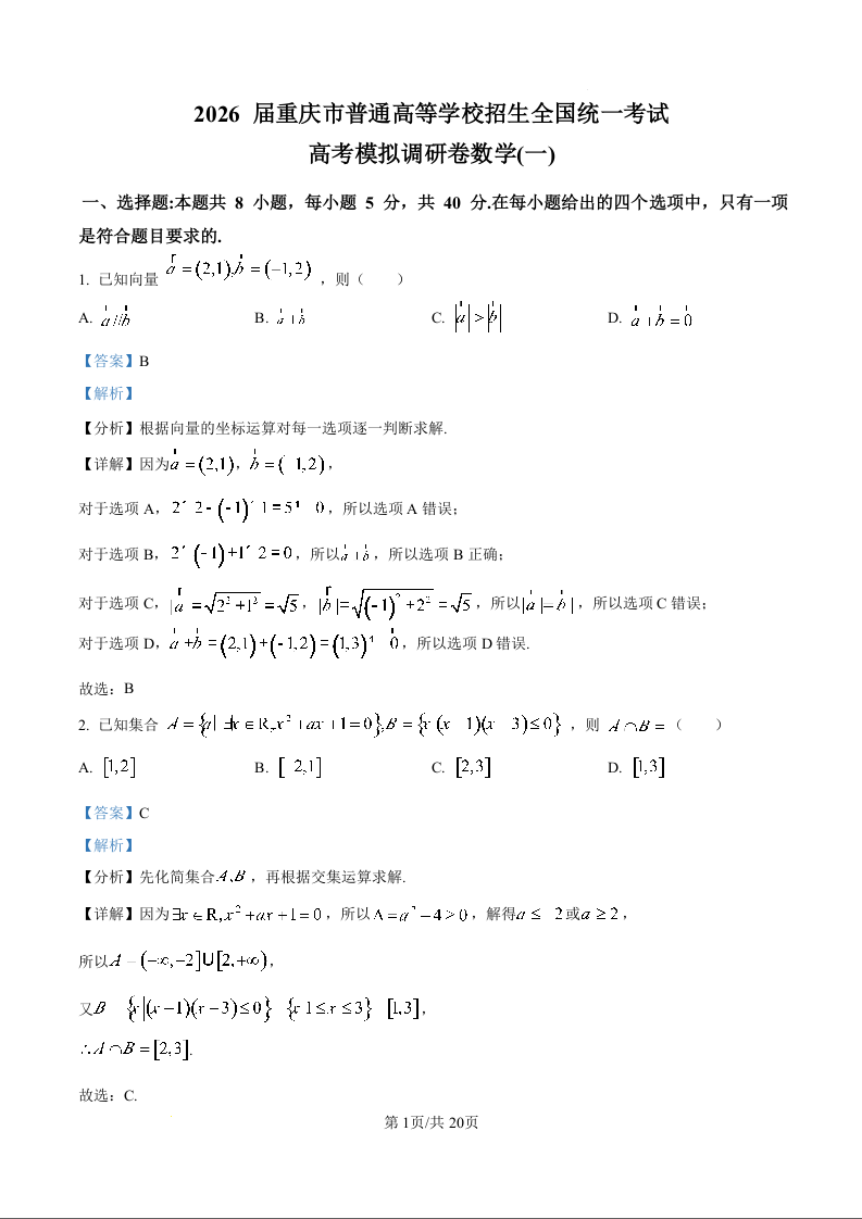 重庆市2026届普通高中学业水平选择性考试高考模拟调研卷(一)数学答案.docx