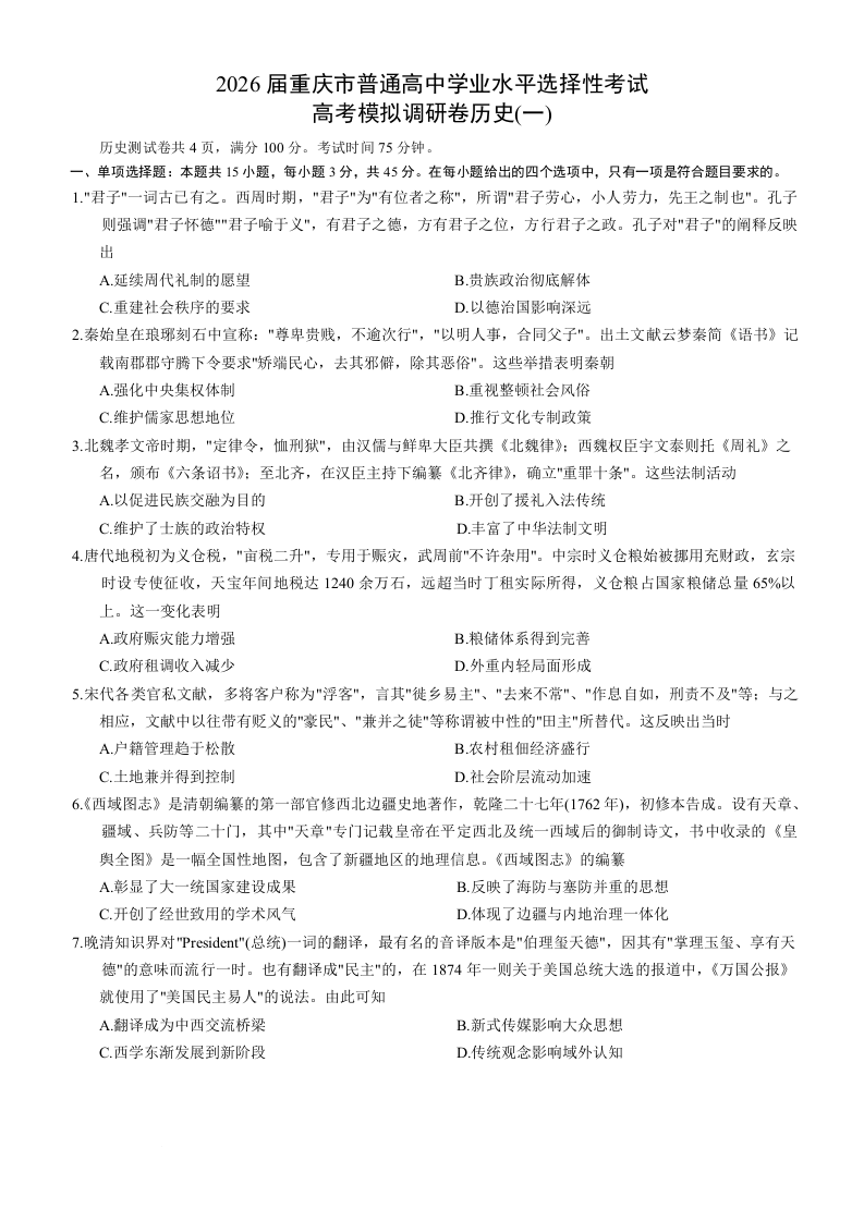 重庆市2026届普通高中学业水平选择性考试高考模拟调研卷(一)历史.docx