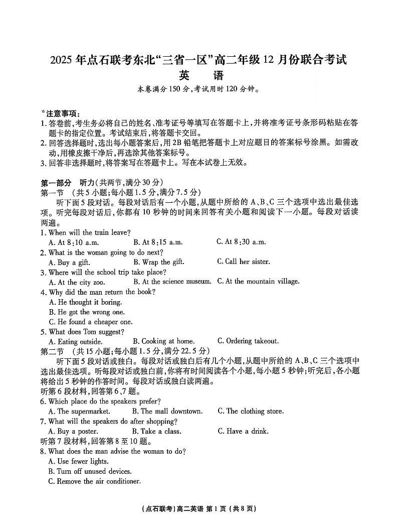 2025年点石联考东北“三省一区”高二年级12月份联合考试 英语试题(含答案).pdf