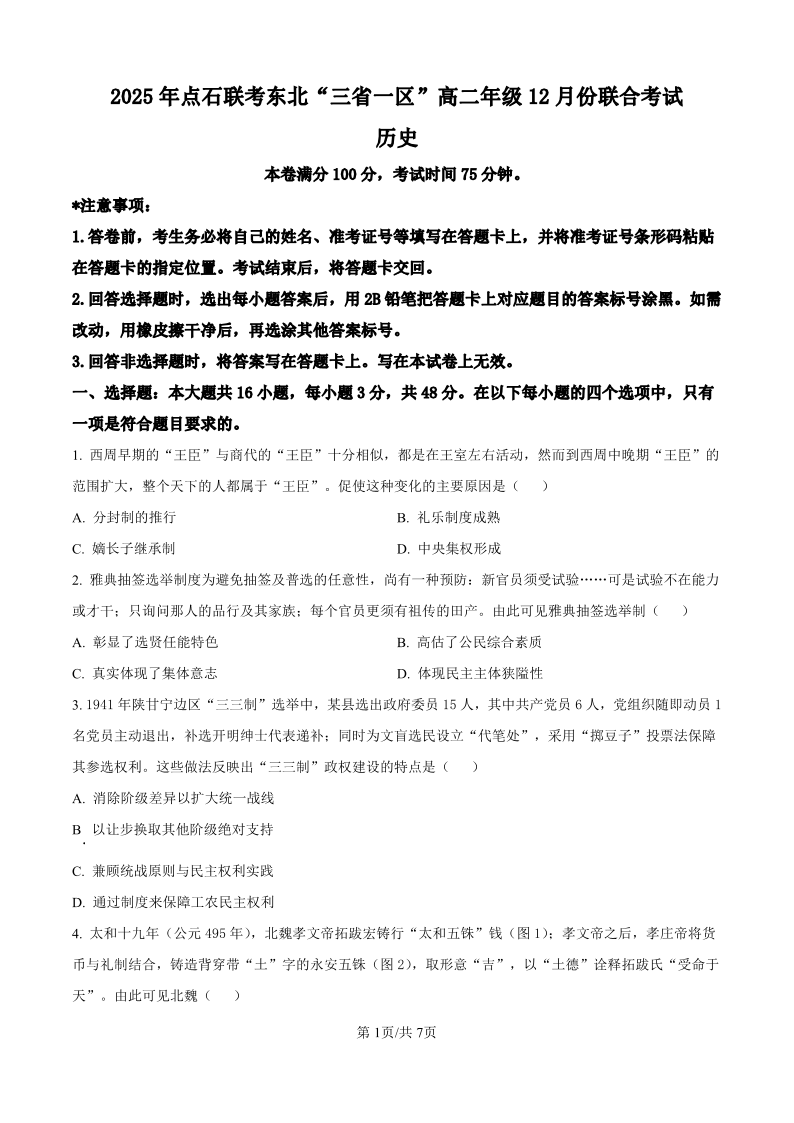 2025年点石联考东北“三省一区”高二年级12月份联合考试 历史试题(含答案).pdf