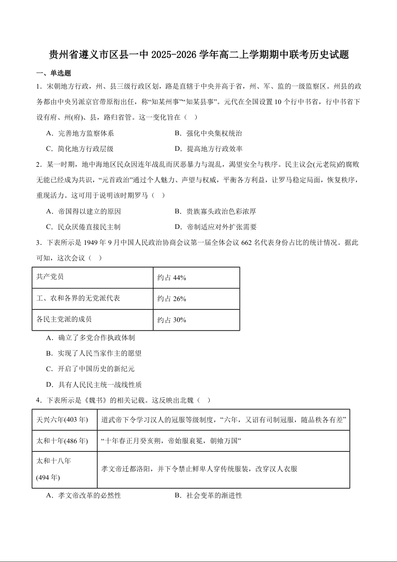 贵州省遵义市区县一中2025-2026学年高二上学期期中联考 历史试卷(含答案).docx