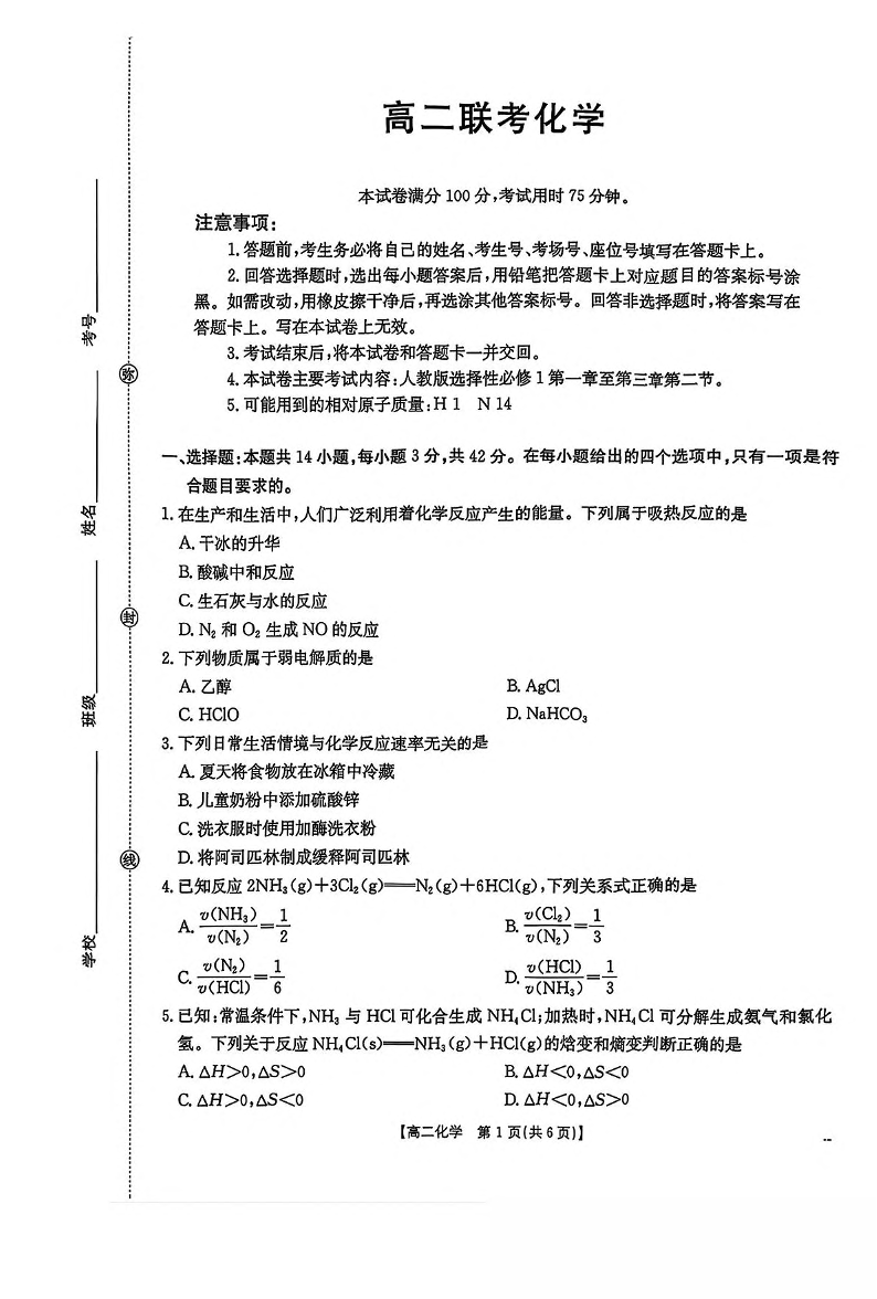 贵州省遵义市区县一中2025-2026学年高二上学期期中联考 化学试卷(含答案).pdf