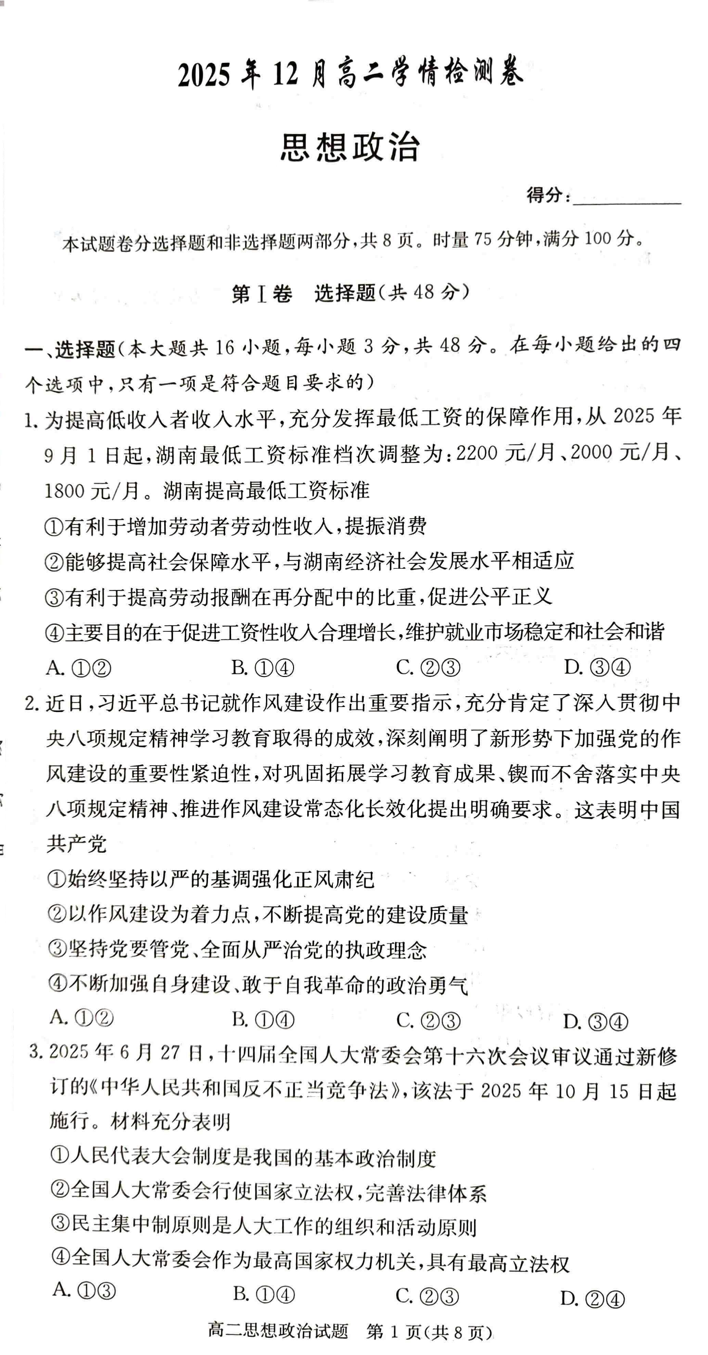 湖南省新高考教学教研联盟(长郡20校)2025年12月高二学情检测 政治.pdf