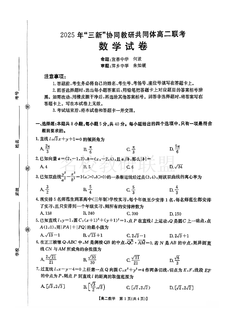 江西省2025年“三新”协同教研共同体高二联考 数学.pdf