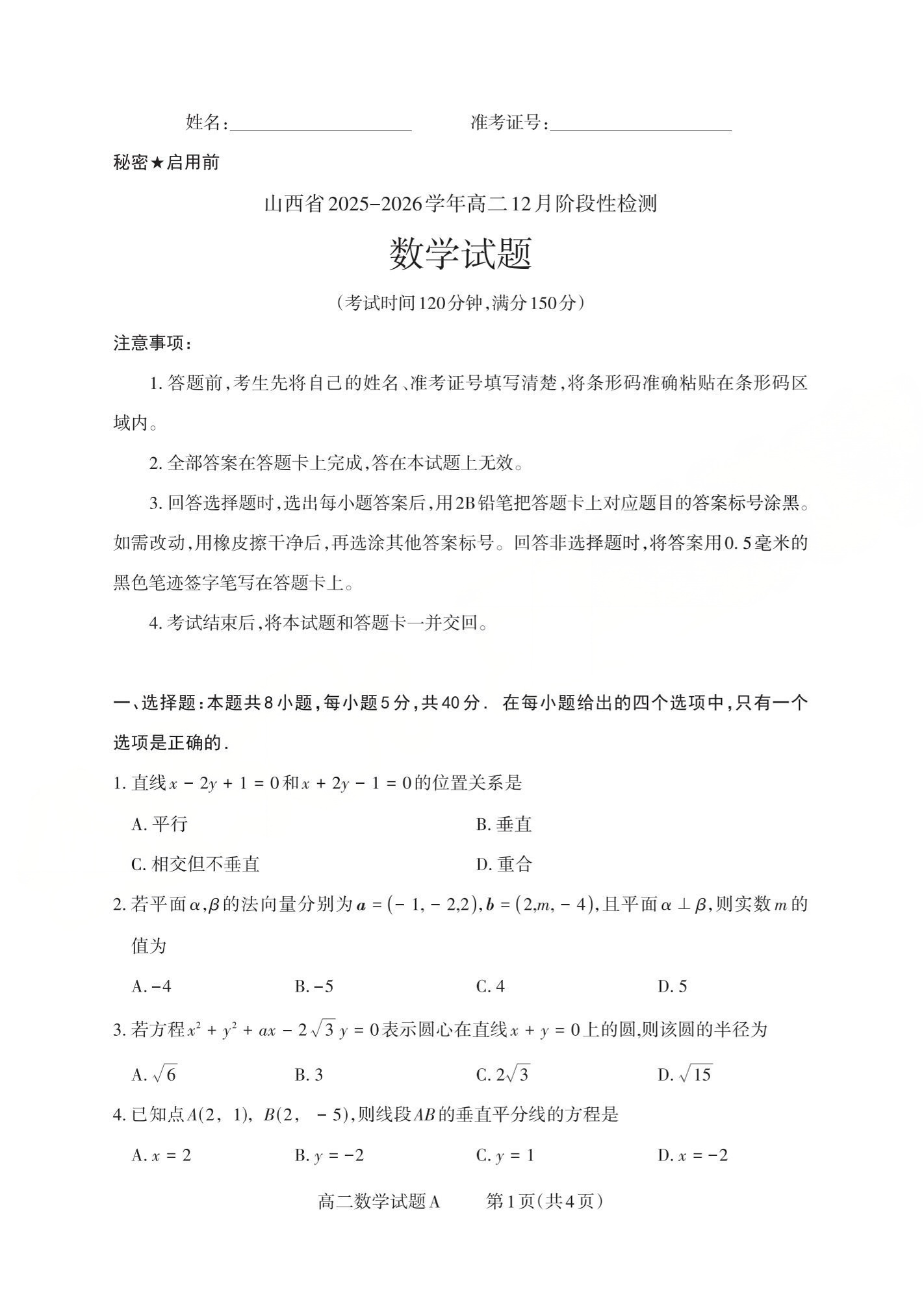 山西省三重教育2025-2026学年高二12月阶段性检测 数学(A卷).pdf