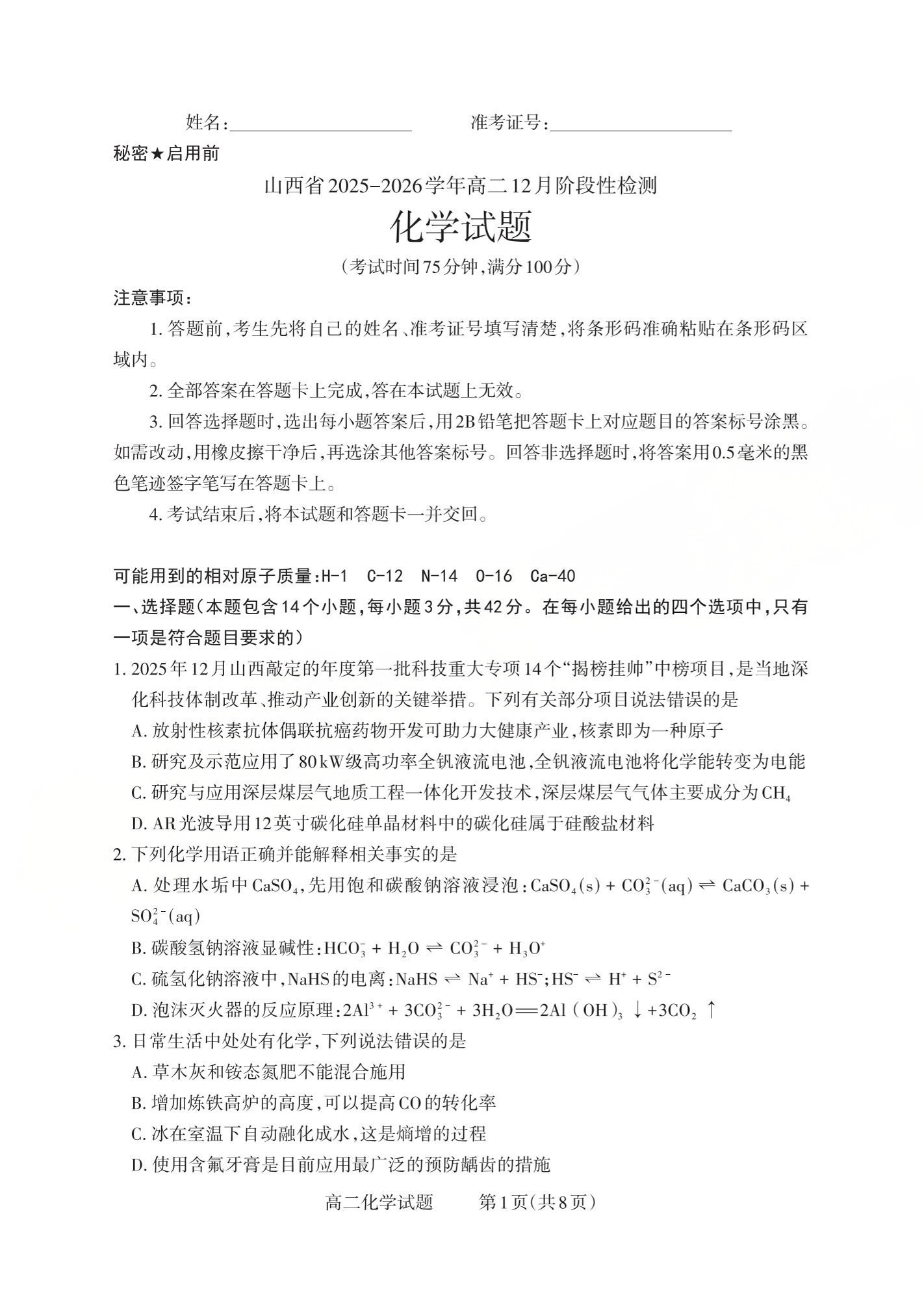 山西省三重教育2025-2026学年高二12月阶段性检测 化学.pdf