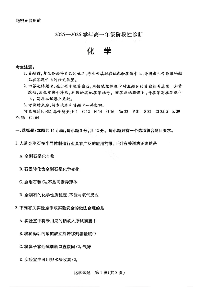 河南省2025-2026学年高一年级12月阶段性诊断 化学.pdf