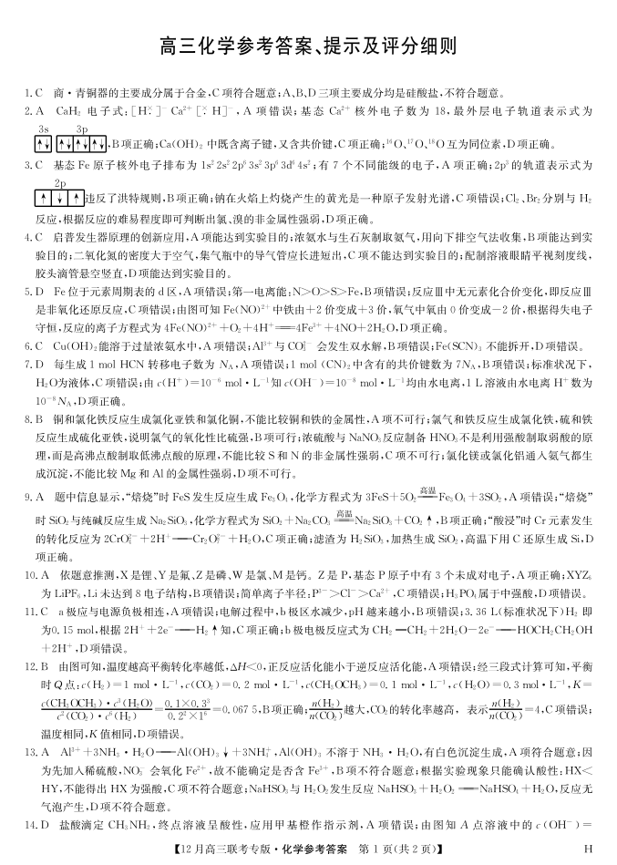 九师联盟2026届高三上学期12月联考 化学答案.pdf