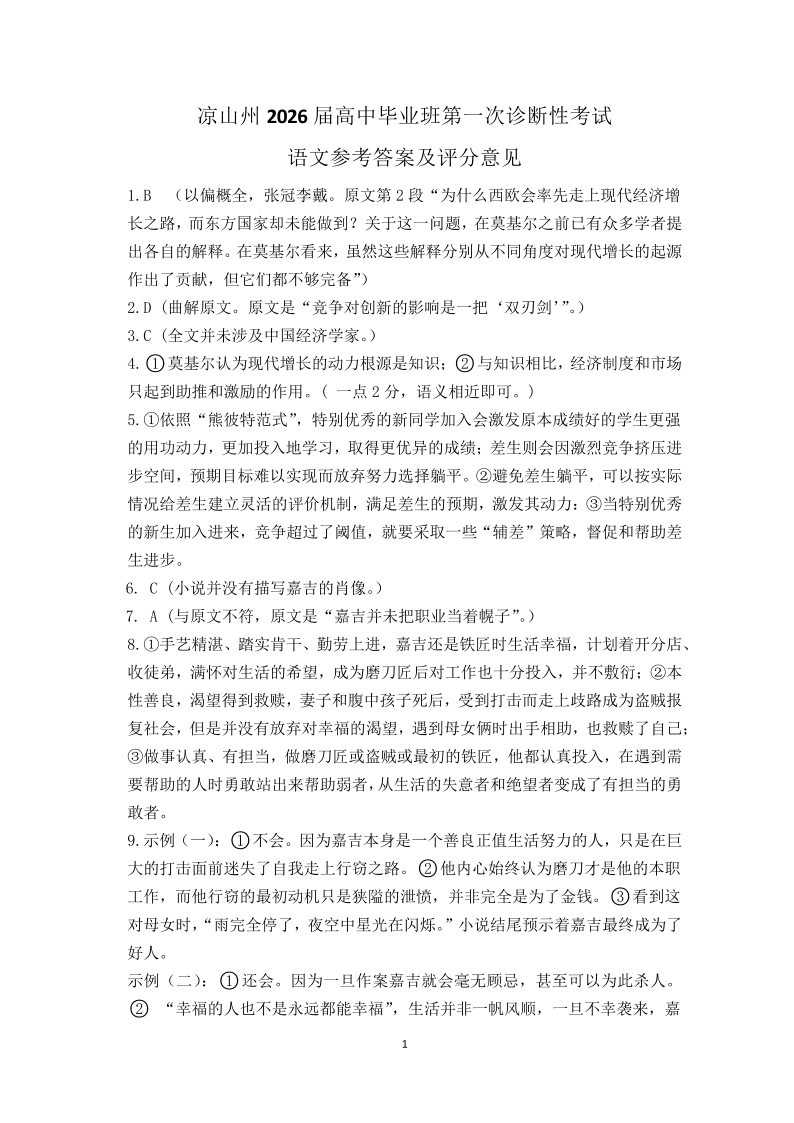 四川省凉山州2026届高中毕业班第一次诊断性考试 语文答案.pdf
