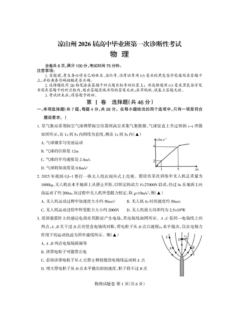 四川省凉山州2026届高中毕业班第一次诊断性考试 物理.pdf
