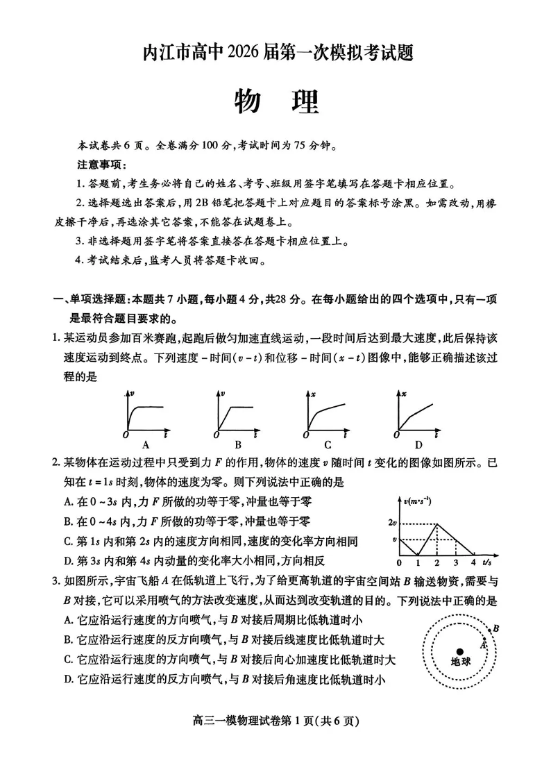 内江市高中2026届第一次模拟考试题 物理.pdf