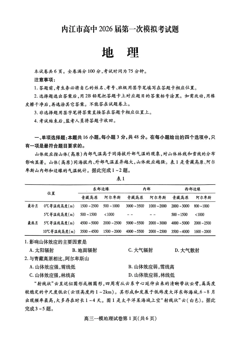 内江市高中2026届第一次模拟考试题 地理.pdf