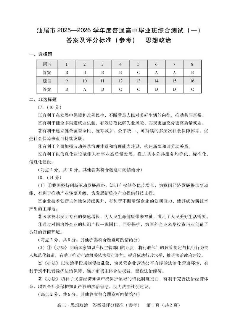 汕尾市2025—2026学年度普通高中毕业班综合测试(一)政治答案.pdf