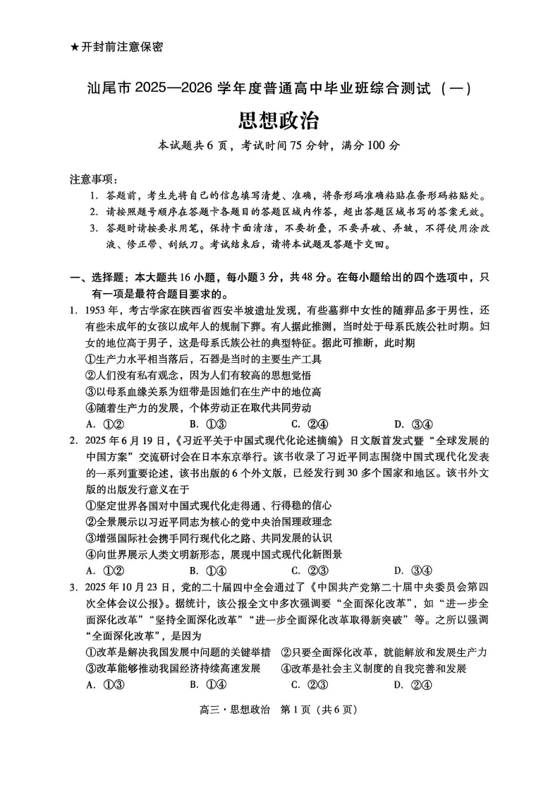 汕尾市2025—2026学年度普通高中毕业班综合测试(一)政治.pdf