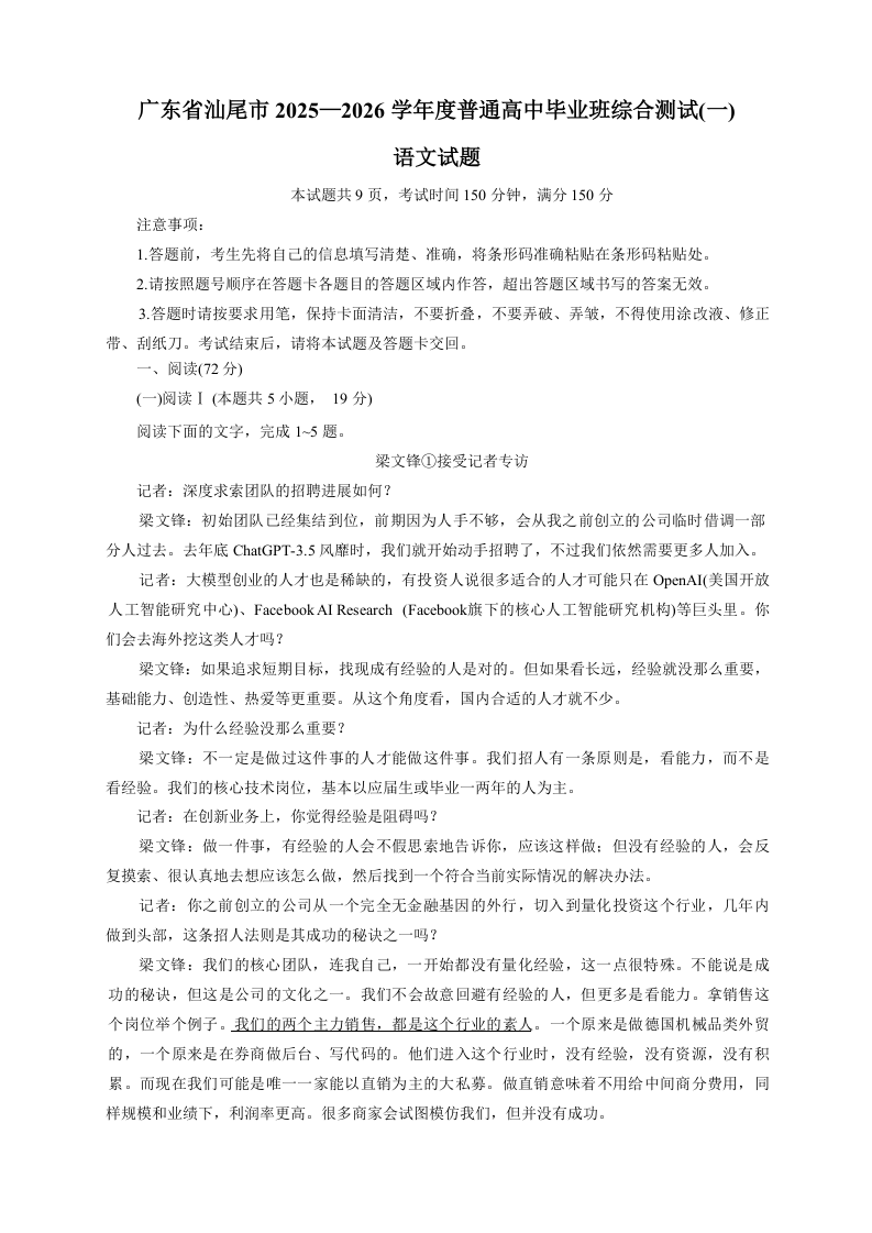 汕尾市2025—2026学年度普通高中毕业班综合测试(一)语文.docx