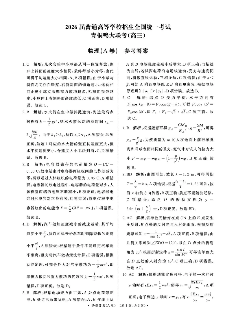 河南省青桐鸣联考2025-2026学年高三上学期12月月考 物理(A卷)答案.pdf