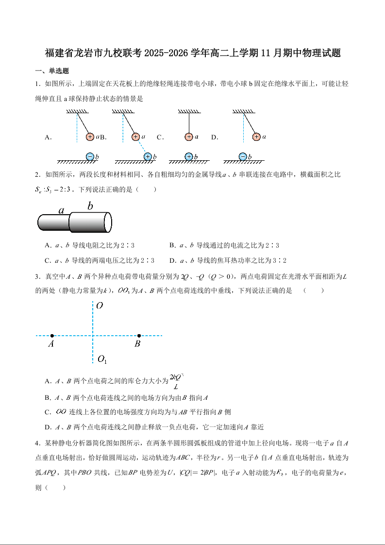 福建省龙岩市一级校盟2025-2026学年高二上学期期中联考 物理试题(含答案).docx