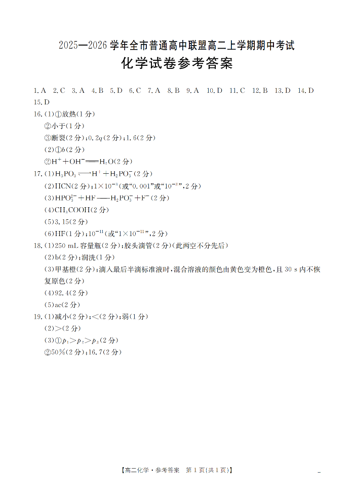 内蒙古赤峰市松山区全市普通高中联盟2025-2026学年高二上学期期中考试 化学答案.pdf