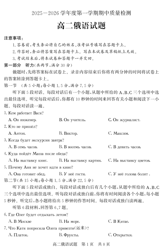 山东省济宁市兖州区2025-2026学年高二上学期期中质量检测 俄语.pdf