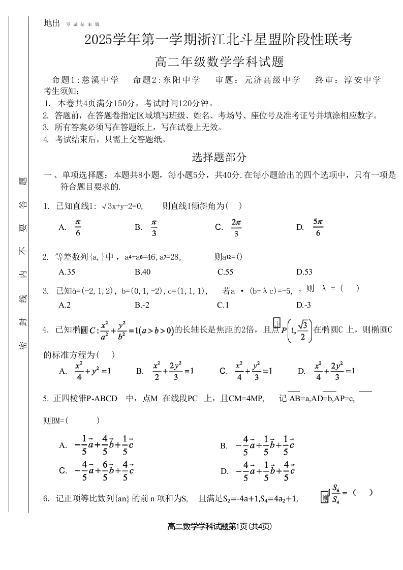 浙江省2025学年第一学期浙江北斗星盟高二年级阶段性联考 数学.docx