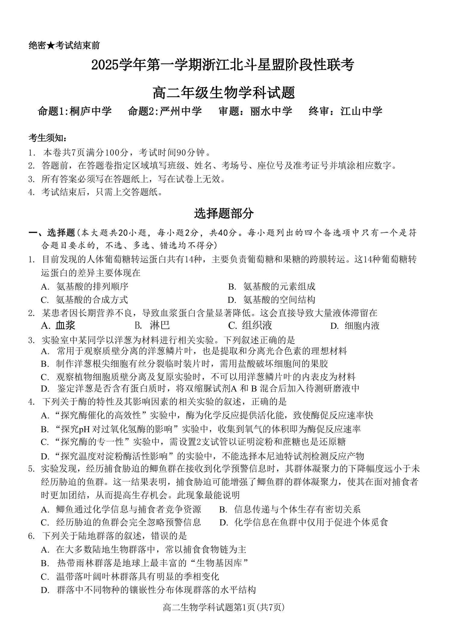 浙江省2025学年第一学期浙江北斗星盟高二年级阶段性联考 生物.docx