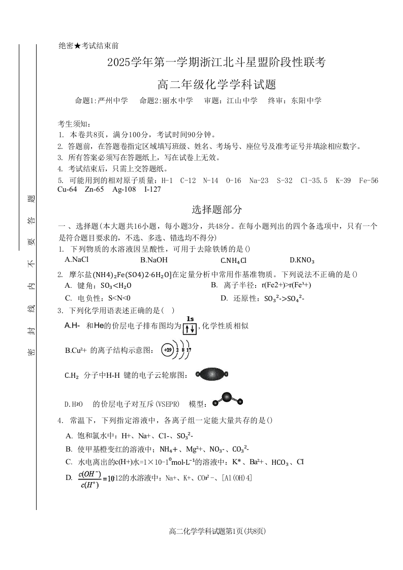 浙江省2025学年第一学期浙江北斗星盟高二年级阶段性联考 化学.docx