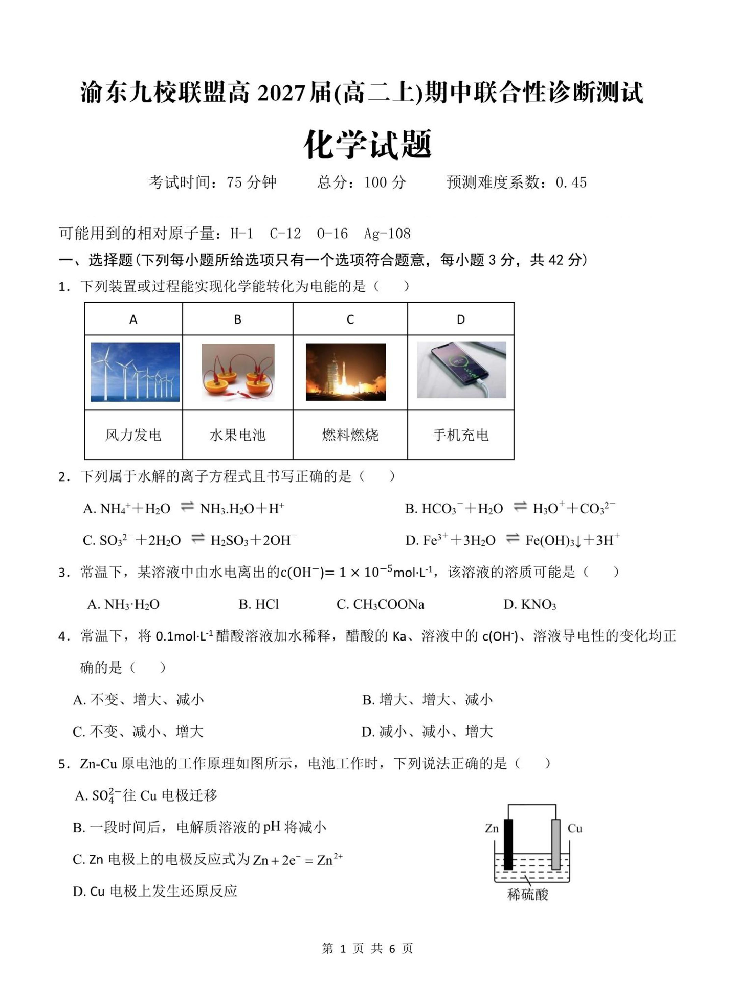 渝东九校联盟高2027届(高二上)期中联合性诊断测试 化学试题(含答案).pdf