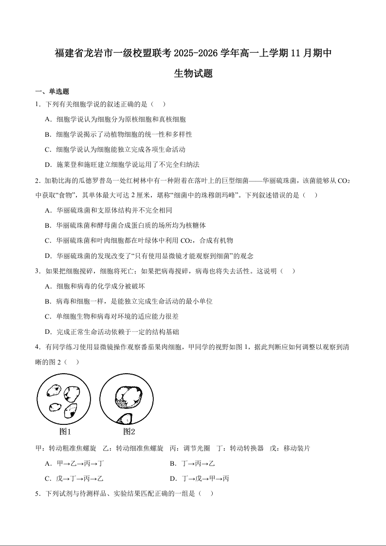 福建省龙岩市一级校盟2025-2026学年高一上学期期中联考 生物试题(含答案).docx