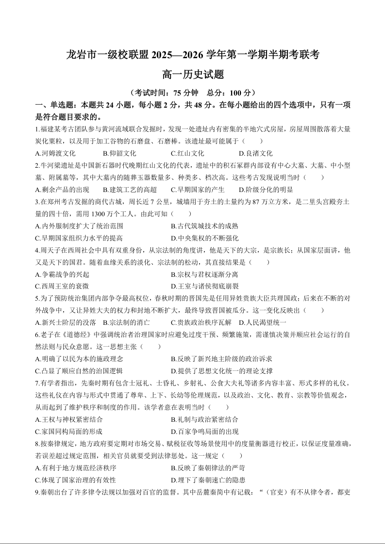 福建省龙岩市一级校盟2025-2026学年高一上学期期中联考 历史试题(含答案).docx