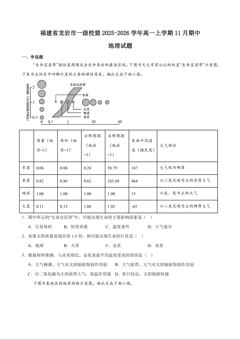 福建省龙岩市一级校盟2025-2026学年高一上学期期中联考 地理试题(含答案).docx