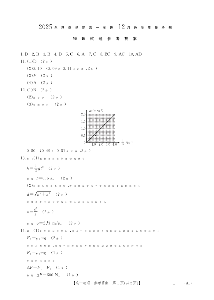 桂林市、贵港市2025年秋季学期高一年级12月教学质量检测 物理答案.pdf